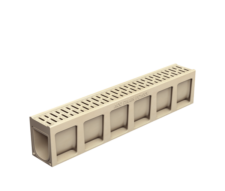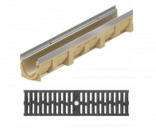 A linear drainage system made of polymer concrete with a cast iron grate. The screwless Drainlock grate mounting ensures quick installation and easy channel cleaning. The grate material can be selected to meet individual functional and aesthetic needs.